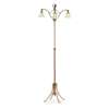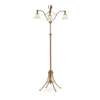 with three curved arms supporting frilled opaline glass shades and supported by curved brackets, the central adjustable reeded column with leafy finial, the whole raised on four curved legs terminating in paw feet