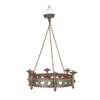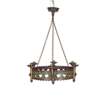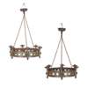 each with quatrefoil pierced and scalloped hoops, with original polychrome painted decoration, supporting six candle sconces with scalloped drip trays suspended by three chains and with original filigree ceiling roses (2)