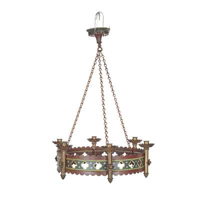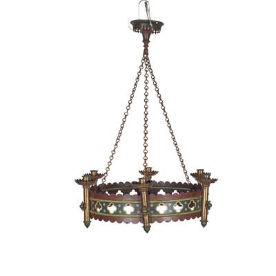 PAIR OF GOTHIC REVIVAL PAINTED IRON AND BRASS MOUNTED CHANDELIERS, CIRCA 1850