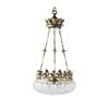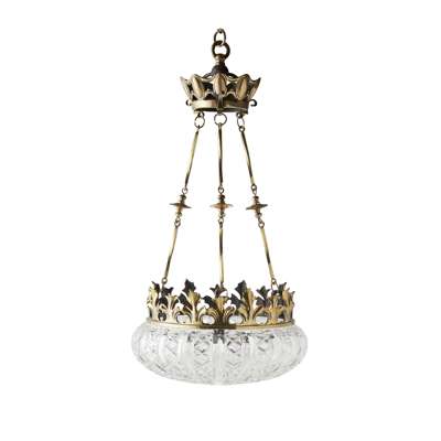 flattened ovoid cut glass shade, supported by a leaf cast cresting and three linked arm supports with flattened disc spacers surmounted by a corona ceiling rose