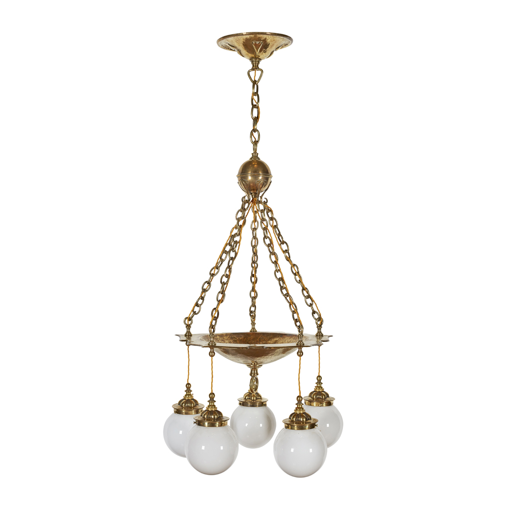 ARTS & CRAFTS BRASS FIVE-LIGHT CHANDELIER, CIRCA 1900