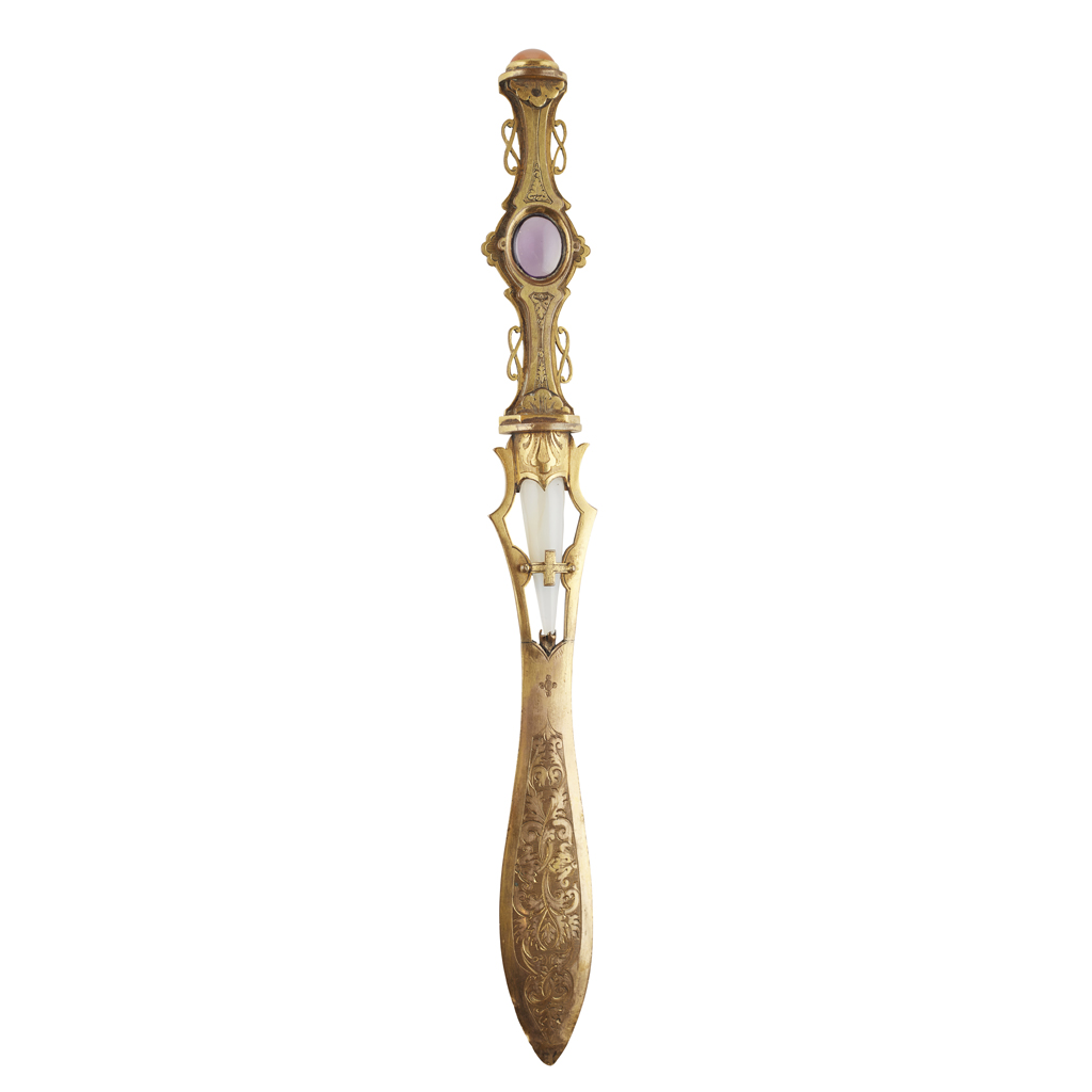 MEDIEVALIST GILT METAL AND JEWELLED PAGE TURNER, CIRCA 1870