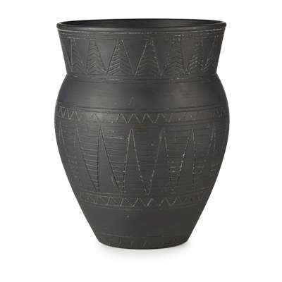 of shouldered form with flared rim, the body decorated with incised serrated bands, impressed marks to base POWELL/ WHITEFRIARS/ WEDGWOOD