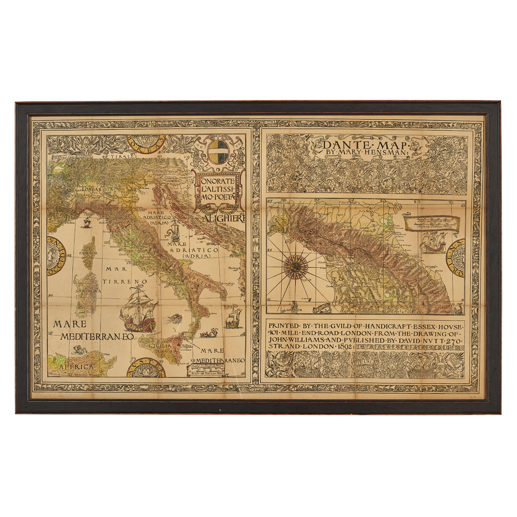 bears inscription DANTE MAP BY MARY HENSMAN/ PRINTED BY THE GUILD OF HANDICRAFT/ ESSEX HOUSE/ ...FROM THE DRAWING OF JOHN WILLIAMS AND PUBLISHED BY DAVID NUT/ 270 STRAND LONDON 1892