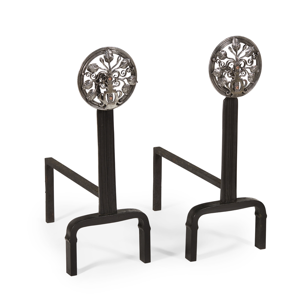PAIR OF ARTS & CRAFTS STEEL AND WROUGHT IRON FIRE DOGS, CIRCA 1900