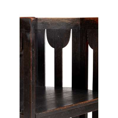 of panelled structure, with pierced and lobed backs and legs, terminating in horizontal uprights and enclosing a plain seat