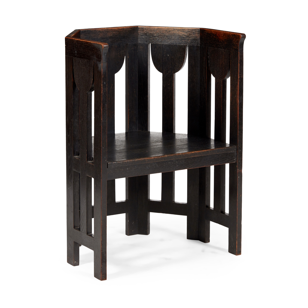 ARTS & CRAFTS STAINED OAK TUB ARMCHAIR, CIRCA 1900