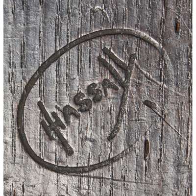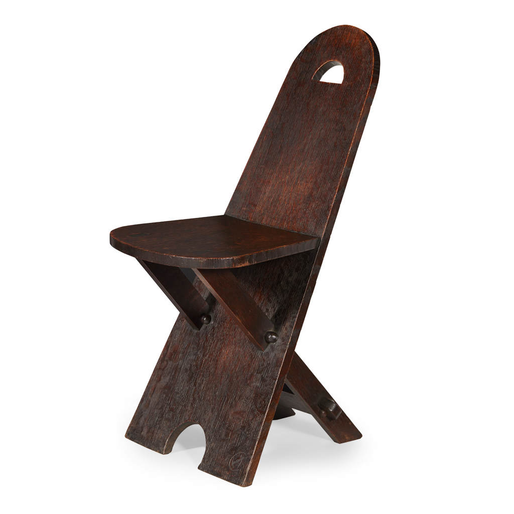 the arched plank back with demi-lune piercing above a solid seat on crossed supports, linked by a stretcher, branded facsimile signature to front J. HASSALL