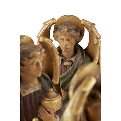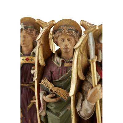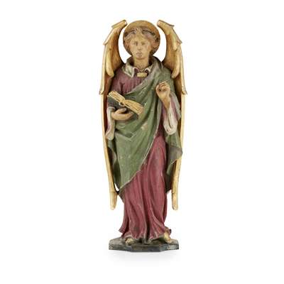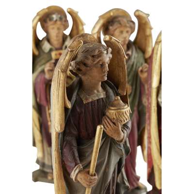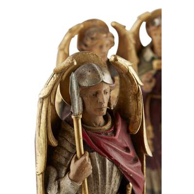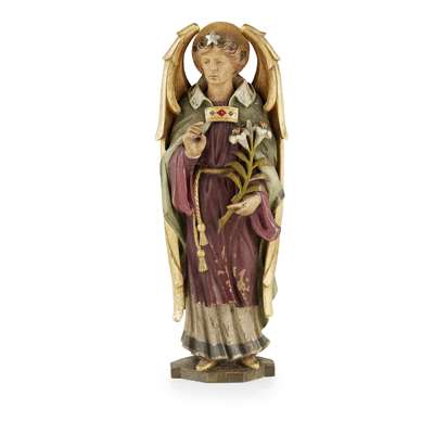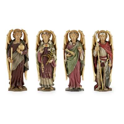 each depicting an archangel carved in relief and painted in gilt, Raphael (with a flask for healing), Gabriel (with the annunciation lily), Uriel (with a book) and Michael (with a sword for slaying the devil), painted in silver and colours (4)
