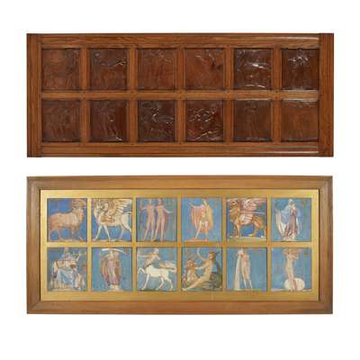 one a SET OF TWELVE WATERCOLOUR STUDIES, watercolour on paper, within single gilt mount and oak frame, each study 21cm x 19cm, oak frame, 66cm x 148.5cm; the other a SET OF TWELVE CARVED OAK PANELS, each in low relief, carved by W.E. Micklewright, each 21.5cm x 19cm, within a moulded oak frame 64cm x 156.5cm (2)