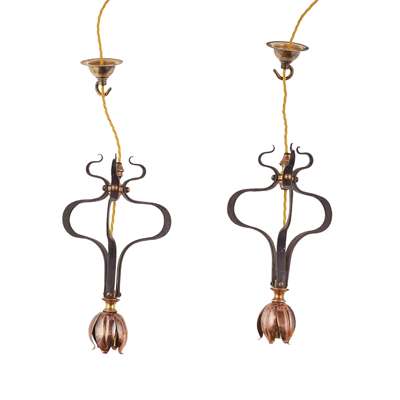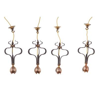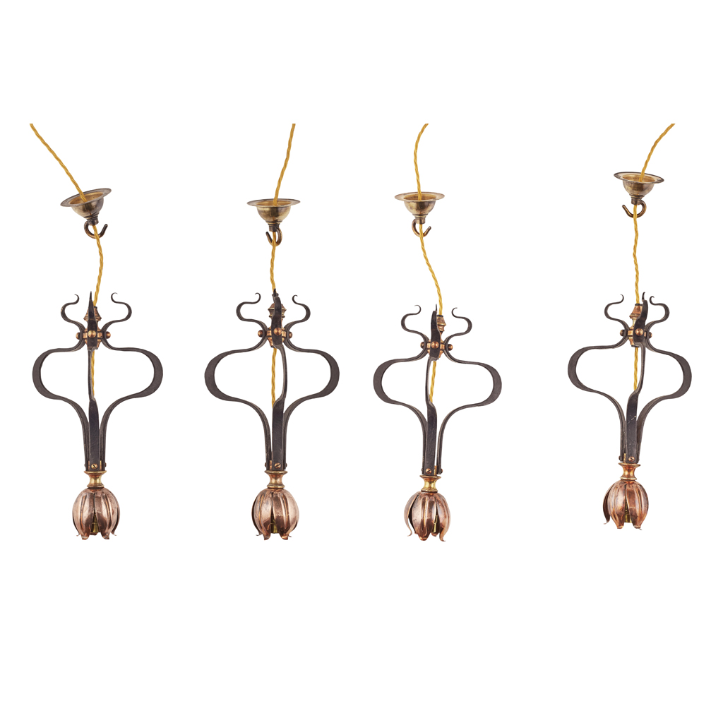 SET OF FOUR ARTS & CRAFTS PAINTED STEEL AND COPPER PENDANT LIGHT FITTINGS, CIRCA 1900