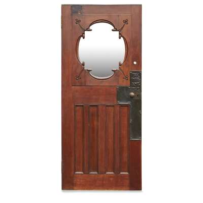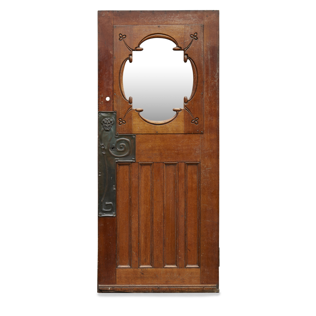 Note: The design of the present oak door and design of the preceding lot demonstrate similarities to doors designed by the architect John Nisbet for 'Kelmscott', built for Sir John McTaggart, a Glasgow property developer and builder, in 1900. The house is now a Grade B listed building and retains many of its original features, including an impressive installation of stained glass by Oscar Paterson who also designed stained glass for the doors. Nisbet, a long-time collaborator with Mactaggart, had been a student and classmate of Charles Rennie Mackintosh at Glasgow School of Art. For this commission he incorporated Scots Baronial and English Queen Anne elements in his design, and the house was decorated and furnished with pieces from the leading Arts & Crafts designers and artists of the day, including Frank Brangwyn, from whom Mactaggart is said to have commissioned two paintings. Nisbet was McTaggart's principal architect and together they were instrumental in the residential development of Glasgow's West End, where no less than 300 tenements were built by his company at the end of the 19th and the first half of the 20th century.