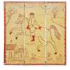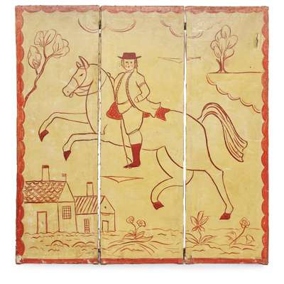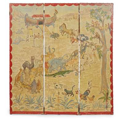 each fold with wooden frame and stretched canvas, painted with oils on canvas, to one side with the animals entering the ark two by two, to the reverse with a horseman in a landscape