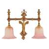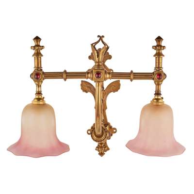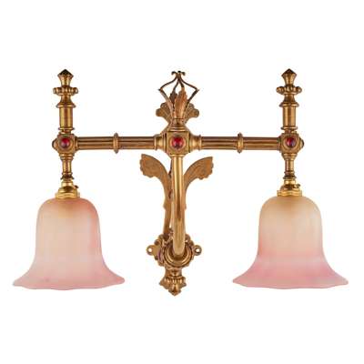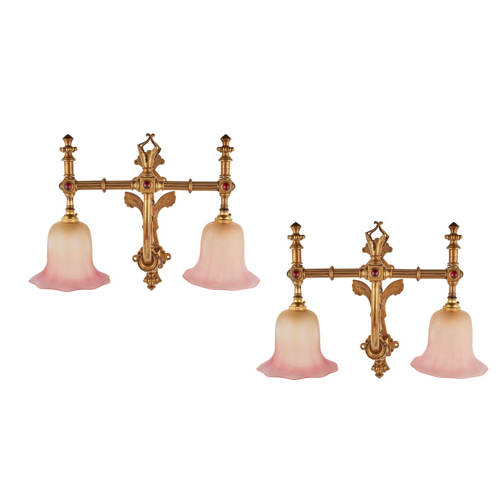 PAIR OF GOTHIC REVIVAL BRASS AND JEWELLED WALL LIGHTS, CIRCA 1870