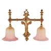 the curved bracket and pierced backplate worked with leaf and dentil decoration, applied fruiting foliage set with red cabochon stones, supporting turned and a pair of blocked brackets, with frosted and period opalescent bell-shaped shades, each converted to electricity (2)