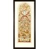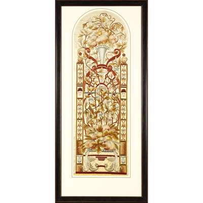 depicting a trellis of fruits and flowering plants within border of masks, flowers and birds, framed and glazed