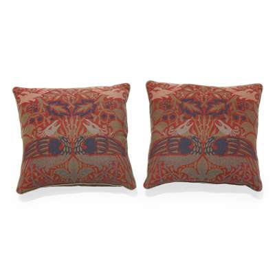 PAIR OF 'PEACOCK & DRAGON' WOVEN WOOL DOUBLE CLOTH CUSHIONS, CIRCA 1880