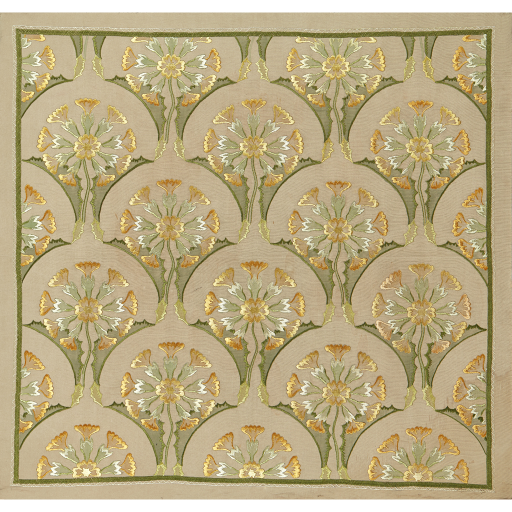 worked in coloured silks with a repeating pattern of stylised cowslips and reserved on an unbleached linen ground, mounted and unframed