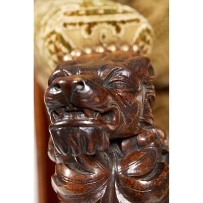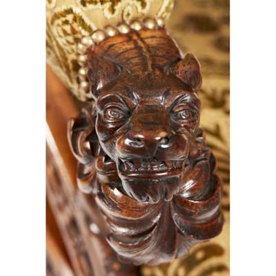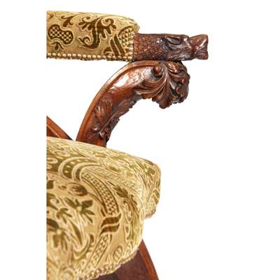 with curved back and padded arms, the frame deeply carved with scrolling foliage to the sides, flanking the mythical beast arm terminals terminating in fish-form tails, raised on front castors, with period olive green velvet upholstery