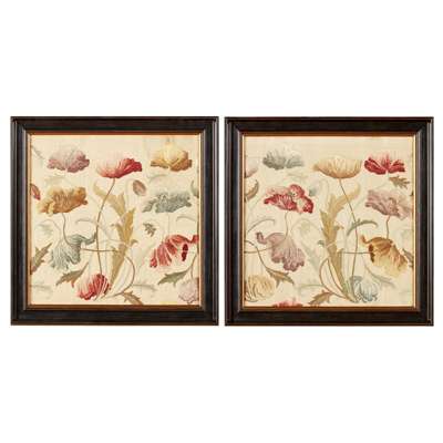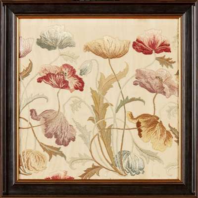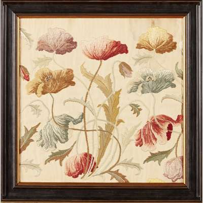 each worked in coloured silks on a satin ground with a frieze of poppies, framed and glazed (2)