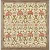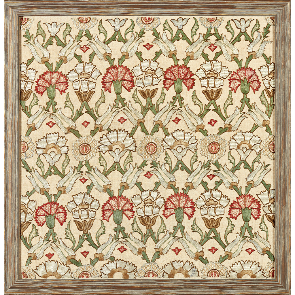 worked in coloured silks on an unbleached linen ground with a repeating pattern of carnations, framed