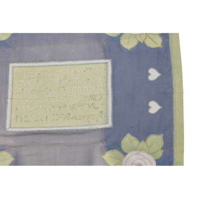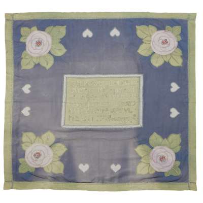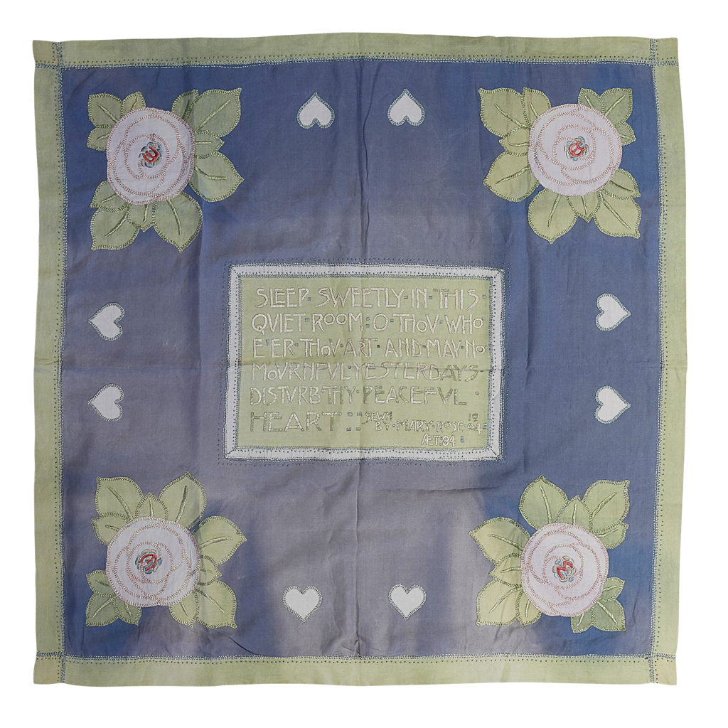 with central panel embroidered in coloured silks with inscription SLEEP SWEETLY IN THIS/ QUIET ROOM O' THOU WHO/ O'ER THOU ART AND MAY NO/ MOURNFUL YESTERDAYS/ DISTURB THY PEACEFUL/ HEART/ SEWN BY MARY ROSE 1904/ AET 84 (Aged 84), within a band of roses and hearts