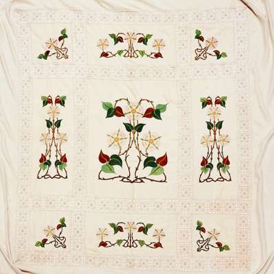 worked in coloured silks with panels of stylised flowering roses within lace borders and further fitted linen border