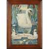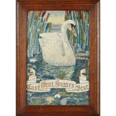 worked as a swan and with embroidered silk banner bearing inscription EAST, WEST, HOME'S BEST, within period oak frame, bears inscription verso THIS WORK WAS DONE BY DOROTHY WALKER AT GROSVENOR ART SCHOOL IN 1912
