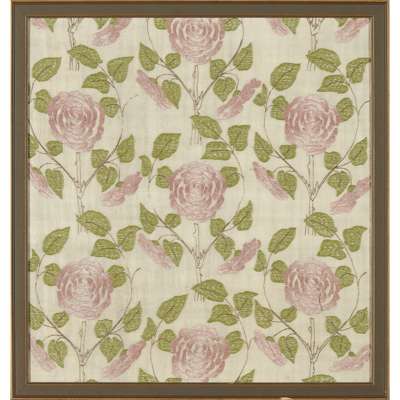 worked as a repeating pattern of flowering roses and reserved on a linen ground, framed and glazed