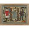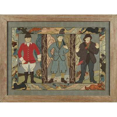 worked in coloured threads and fabrics and depicting a huntsman; a gun and a fisherman in a landscape and enclosed by a band of country animals on a linen ground, in original Rowley Gallery frame
