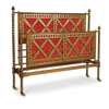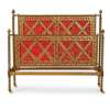 with red and gold damask panelled headboard and corresponding footboard, each with pierced gilt brass bands with stylised foliate decoration, bears maker's label