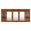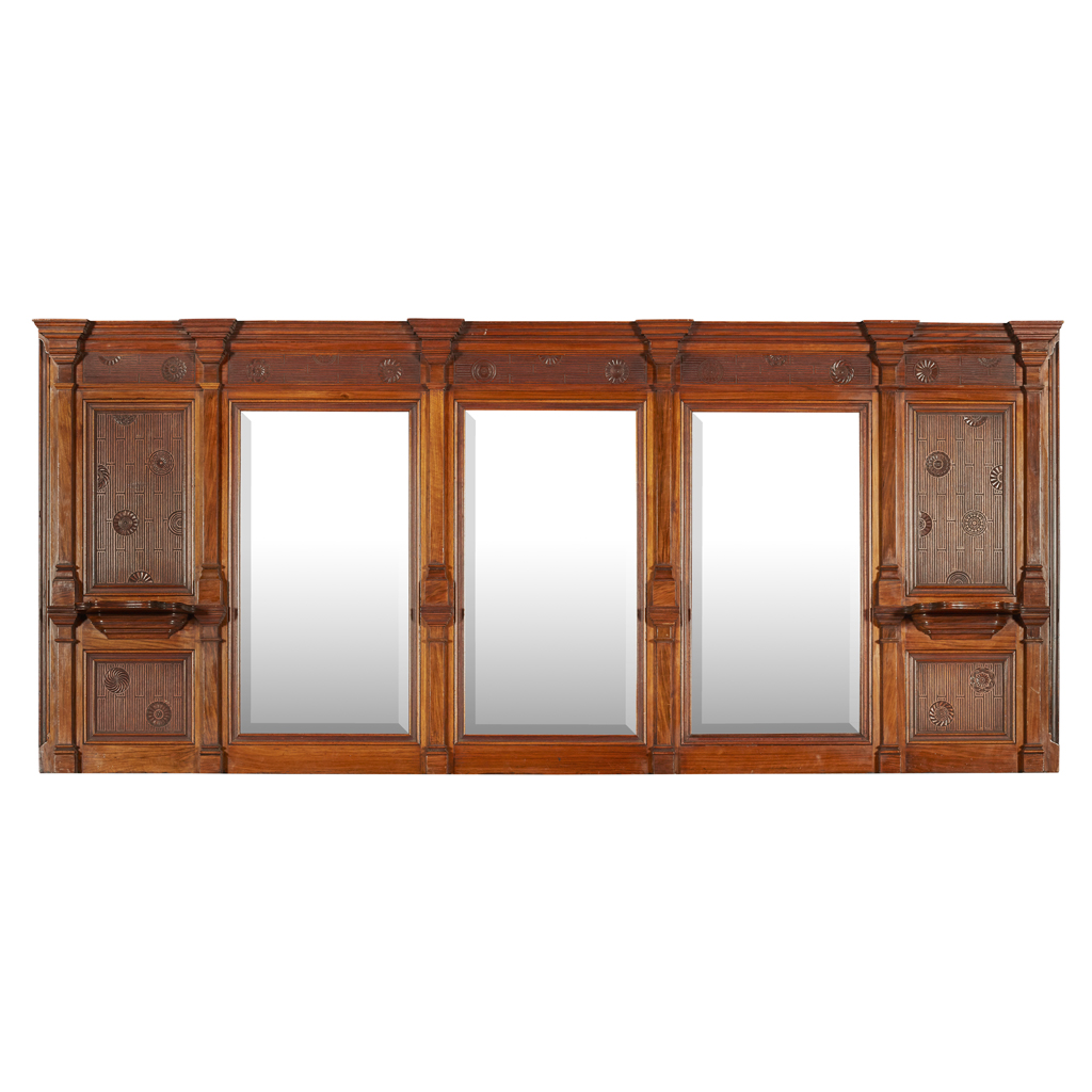 the bevelled mirrors flanked by columns and carved stained panels in the Japanese style, the side sections with small protruding shelves