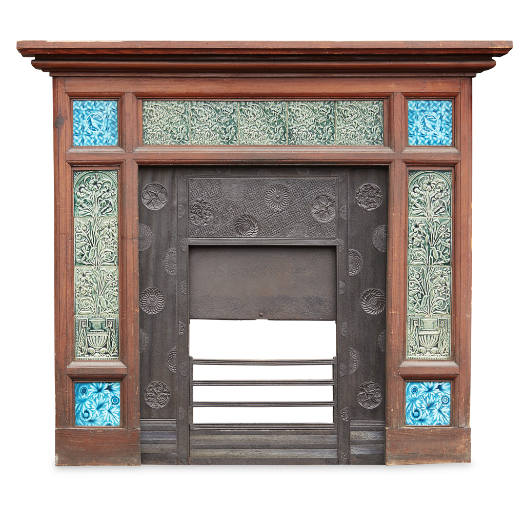 the cast iron surround with Japanese motifs, enclosed by associated fireplace in stained hardwood set with tiles by William Godwin of Lugwardine
