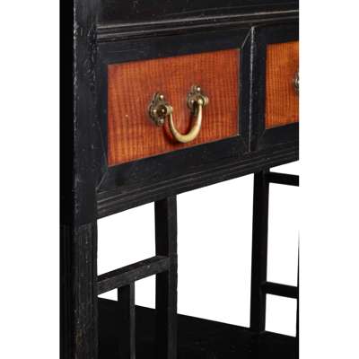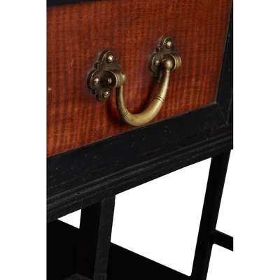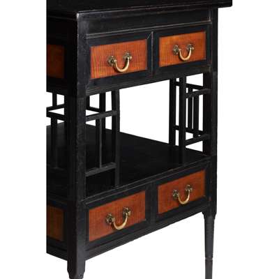Note: The tapered legs, latticed middle supports and U-shaped handles all conform to Godwin's work of the mid-1870's as do the drawer arrangements, a characteristic feature. Soros also asserts that the high elevation of the lower drawer is 'in keeping with Godwin's desire to keep the floor accessible for cleaning.