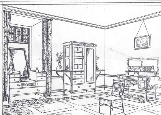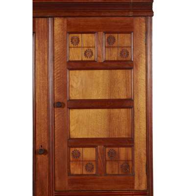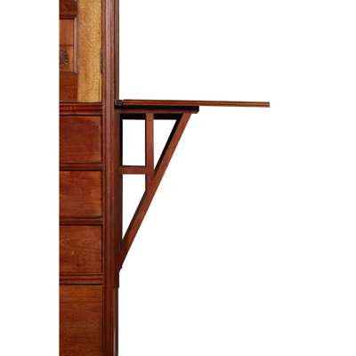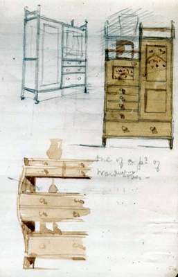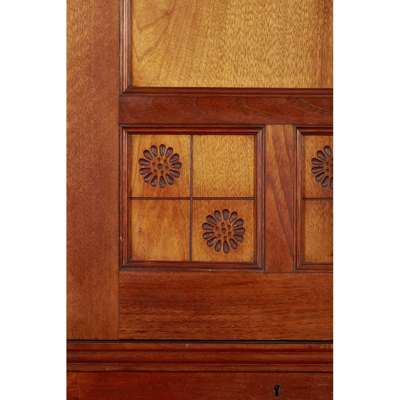 Note: A similar wardrobe in deal is illustrated in William Watt, Art Furniture from 'Designs by E.W. Godwin', F. S. A., London, 1877, pl. 16. Priced at £18.18s0d., the wardrobe had minimal decoration and was described in the brochure as "usually enough (space) for a gentleman whose means were limited." Presumably this is a more expensive version in walnut with single folding shelf and carved details, however the layout of the panelling, drawers and cupboards are identical to the example in the brochure.