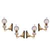 each with elaborate backplates and hinged arms, cast and pierces with sunflowers and stylised foliage and supporting a glass reservoir, brass fittings and clear and original frosted globe shades, converted to electricity (4)