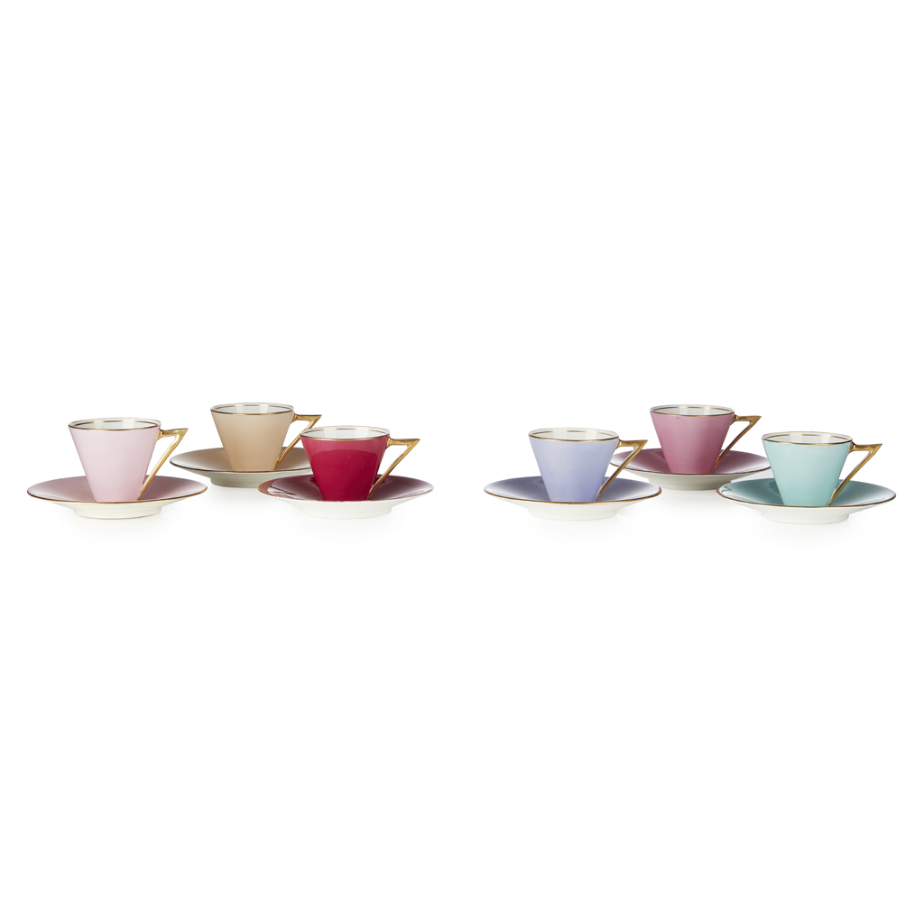 with gilt decoration, each cup of conical form with angular handles with matching saucers, printed registration marks for 1876 (12)