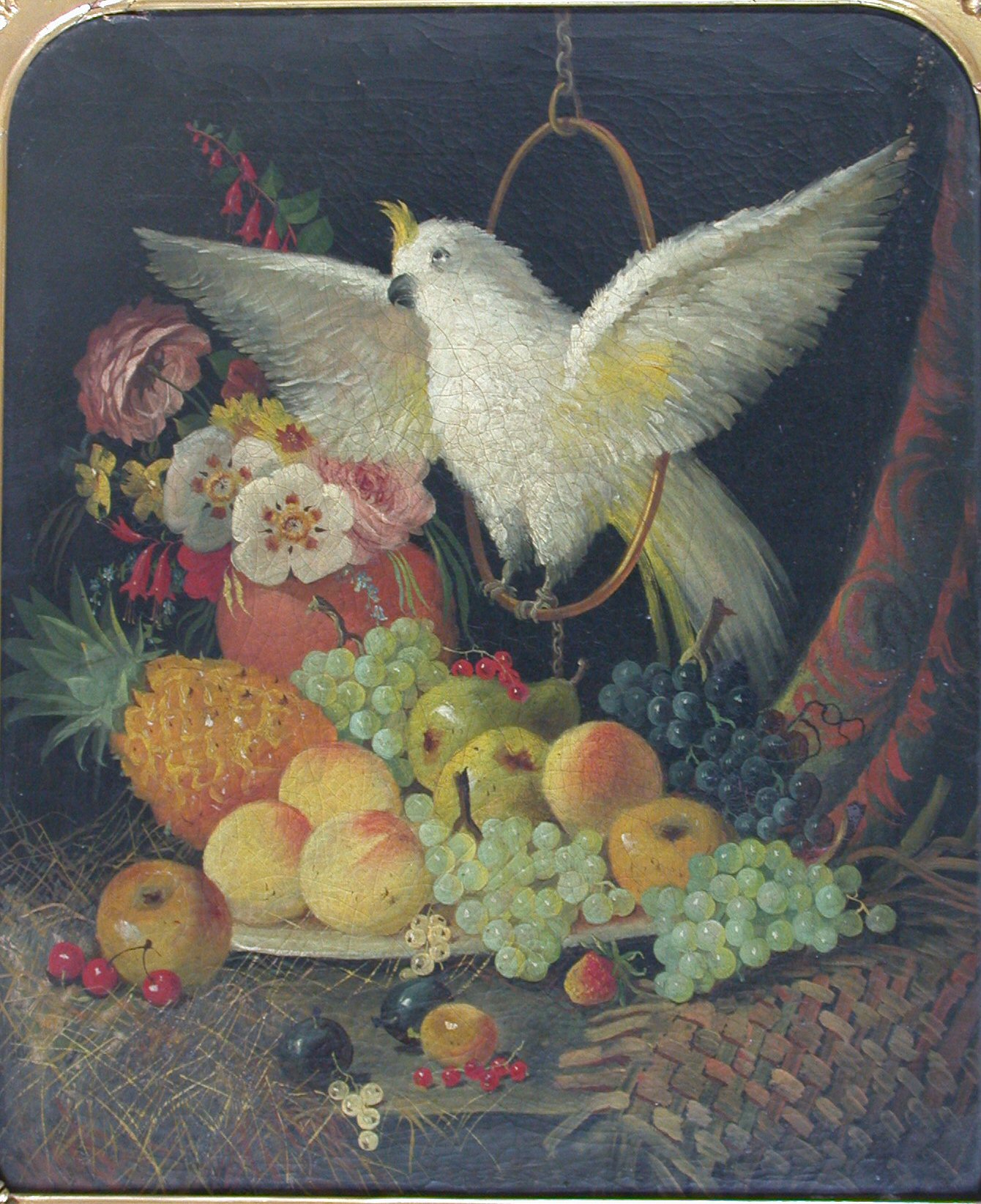 A STILL LIFE OF ASSORTED FRUIT AND PARAKEET