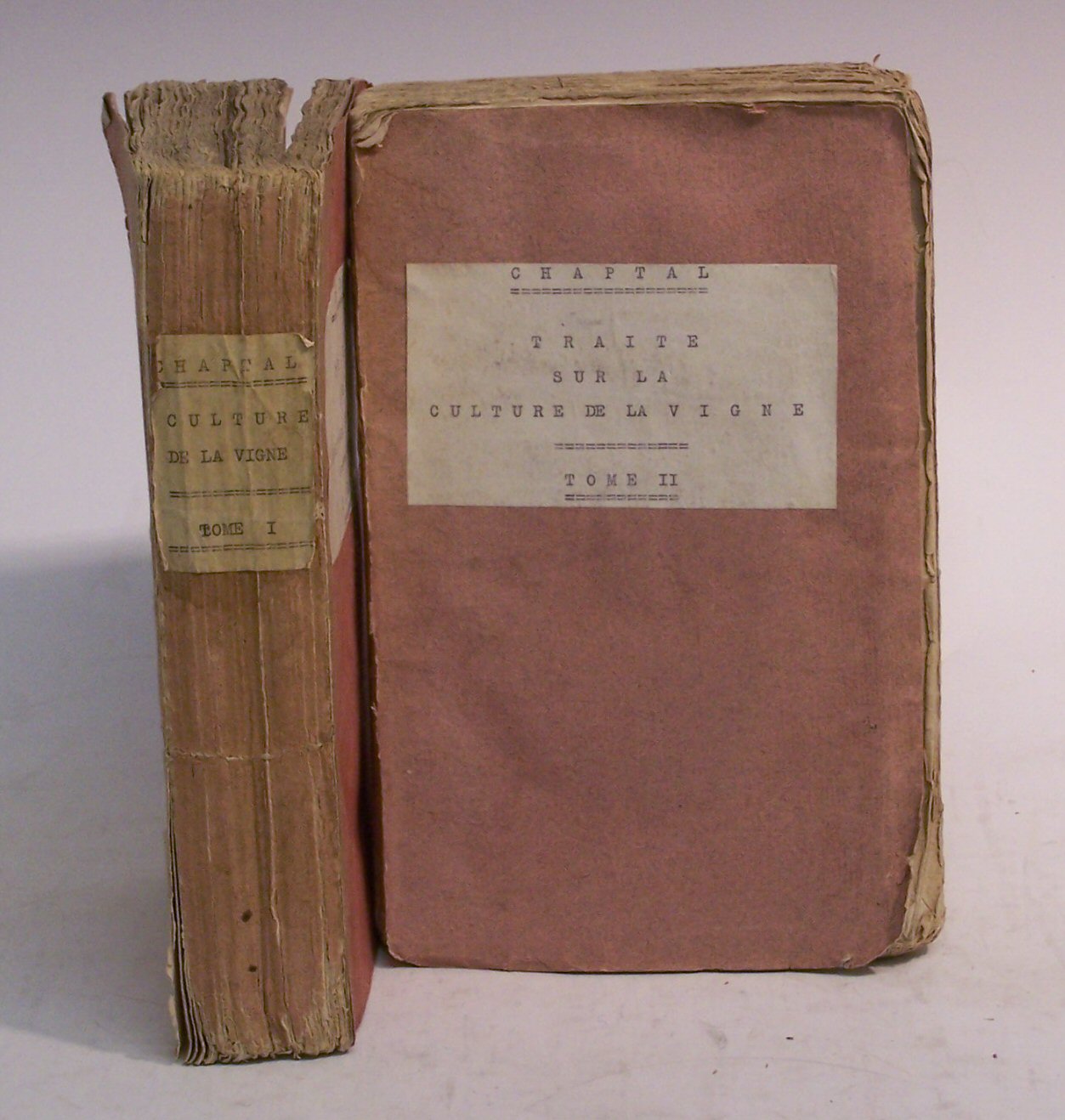 Traité théorique et pratique sur la culture de la vigne avec l'art de faire le vin, les eaux-de-vie, esprit-de-vin... Tome premier (-second). Paris: Delalain, 1801. First edition, 2 volumes, 8vo (215 x 140mm.), engraved plates, paper wrappers, uncut, occasional slight staining, wrappers worn