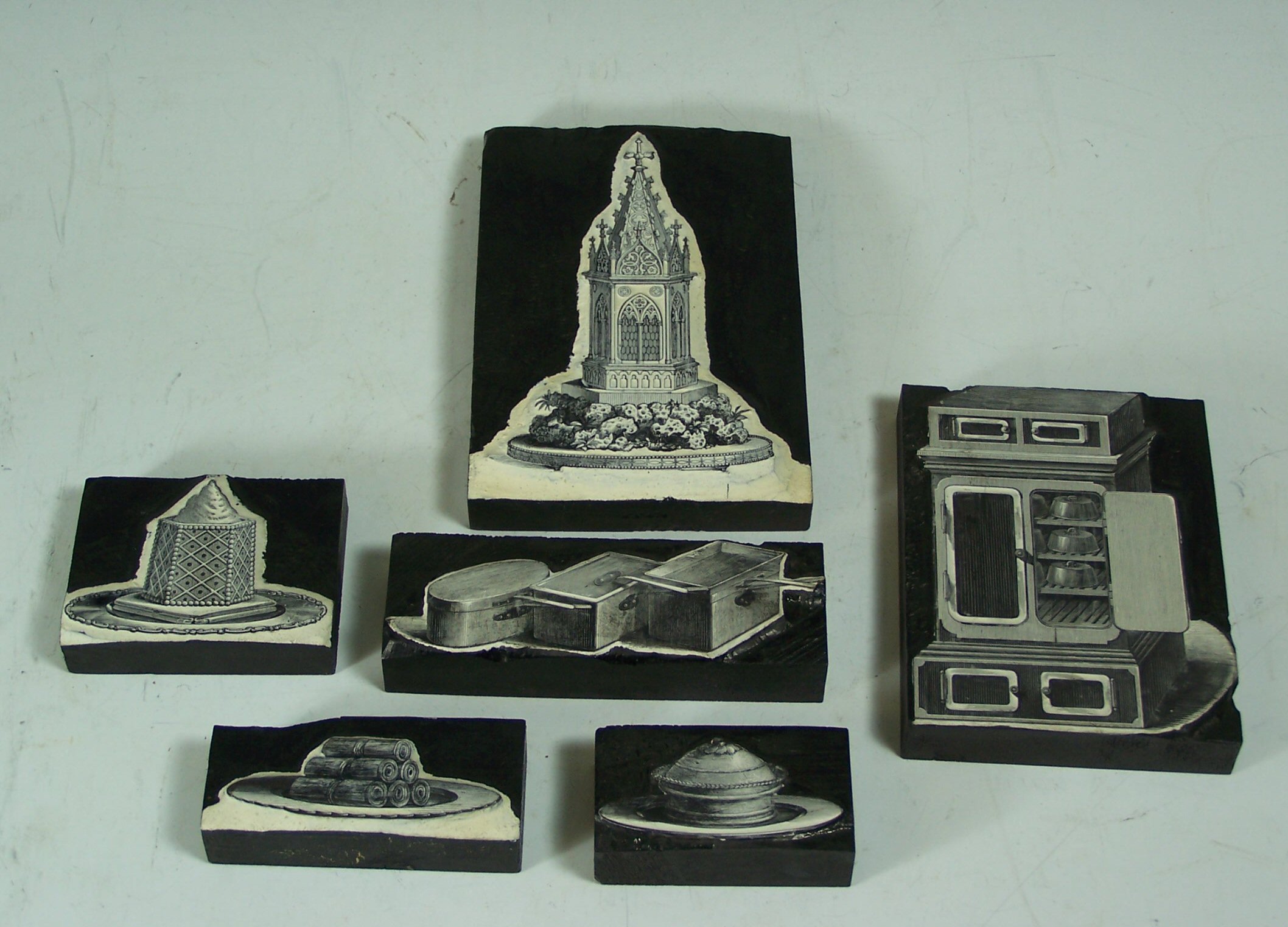 15 original French ?boxwood blocks engraved with designs of dishes, saucepans, ovens &c., for such books as Le Livre Patisser (1883), Dubois's Cuisine de tous les pays (1895), Cuisine Classique (1881), Ecoles des Cuisinieres (1883), and others, 14 x 10cm and smaller