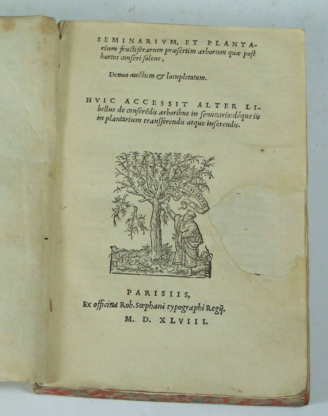 Seminarium et plantarium fructiferarum praesertim arborum. Paris: Rob. Estienne, 1548, 8vo, later marbled wrappers, portion of fore-margin restored, spine worn