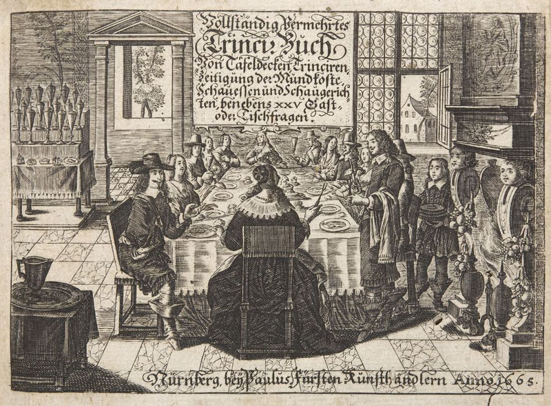 Vollständiges und von neuem vermehrtes Trincir-Buch. Nuremberg: Christoph Gerhard for Paul Fürst, [1665], 5 parts in one volume, oblong 4to (134 x 170mm.), additional general engraved title dated 1665, engraved portrait of the dedicatee Maximilian Wilibald, engraved title to part 2, additional engraved title to part 4, letterpress titles within typographical borders to parts 1 & 3-5, one (of 2) folding engraved plates, 56 (of 58) full-page engravings, later vellum, lacking 2 leaves in part 1 (C2-3), lacking 2 engravings and one of 2 folding plates in part 1, the other folding plate defective, long tears through several leaves, small portion of engraving on Oo3 missing, a few small wormholes, some light browning, binding worn at edges