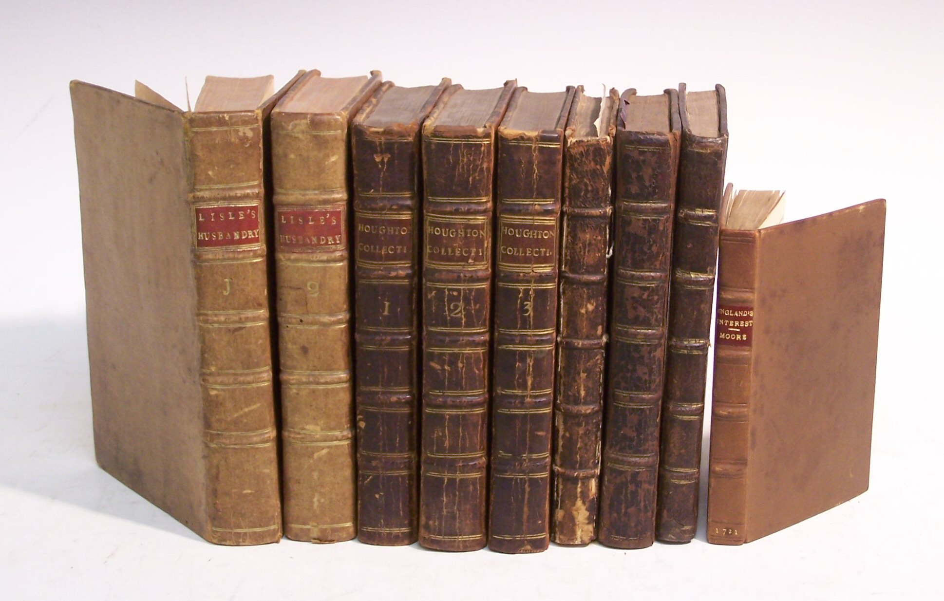 Observations in Husbandry. London: J. Hughs, 1757. Second edition, 8vo, 2 volumes, engraved folding portrait, contemporary calf, very slight worming in margin of volume 1; Houghton, John. Husbandry and Trade Improv'd... revised by Richard Bradley. London: Woodman and Lyon, 1727, 8vo, 3 volumes, titles printed in red and black, contemporary calf, bookplates of André Simon, slightly rubbed; [Le Lorrain de Vallemont, Pierre] Curiosities of Nature and Art in Husbandry and Gardening. London: D. Brown, A. Roper and Franc. Coggan, 1707, 8vo, engraved frontispiece and 11 plates, contemporary calf, slight staining in upper margin, and spotting, slightly rubbed; Cowell, John. The Curious and Profitable Gardener. London: Richard Montagu, 1730. First edition, 8vo, folding engraved plate, contemporary calf, rubbed, neat repair to head and tail of spine; Thorley, John. Melissologia, or the Female Monarchy... of Bees. London: for the Author, 1744. First edition, 8vo, engraved frontispiece and 4 plates, one folding, contemporary calf, slight offsetting to plates, worn, upper cover almost detached; Moore, J. England's Interest: or the Gentleman and Farmer's Friend. London: A. Bettesworth, 1721, 12mo, advertisement leaf at end, modern calf by Sangorski and Sutcliffe, inscription of collection Strassburger on front endpaper and 2 others (11)