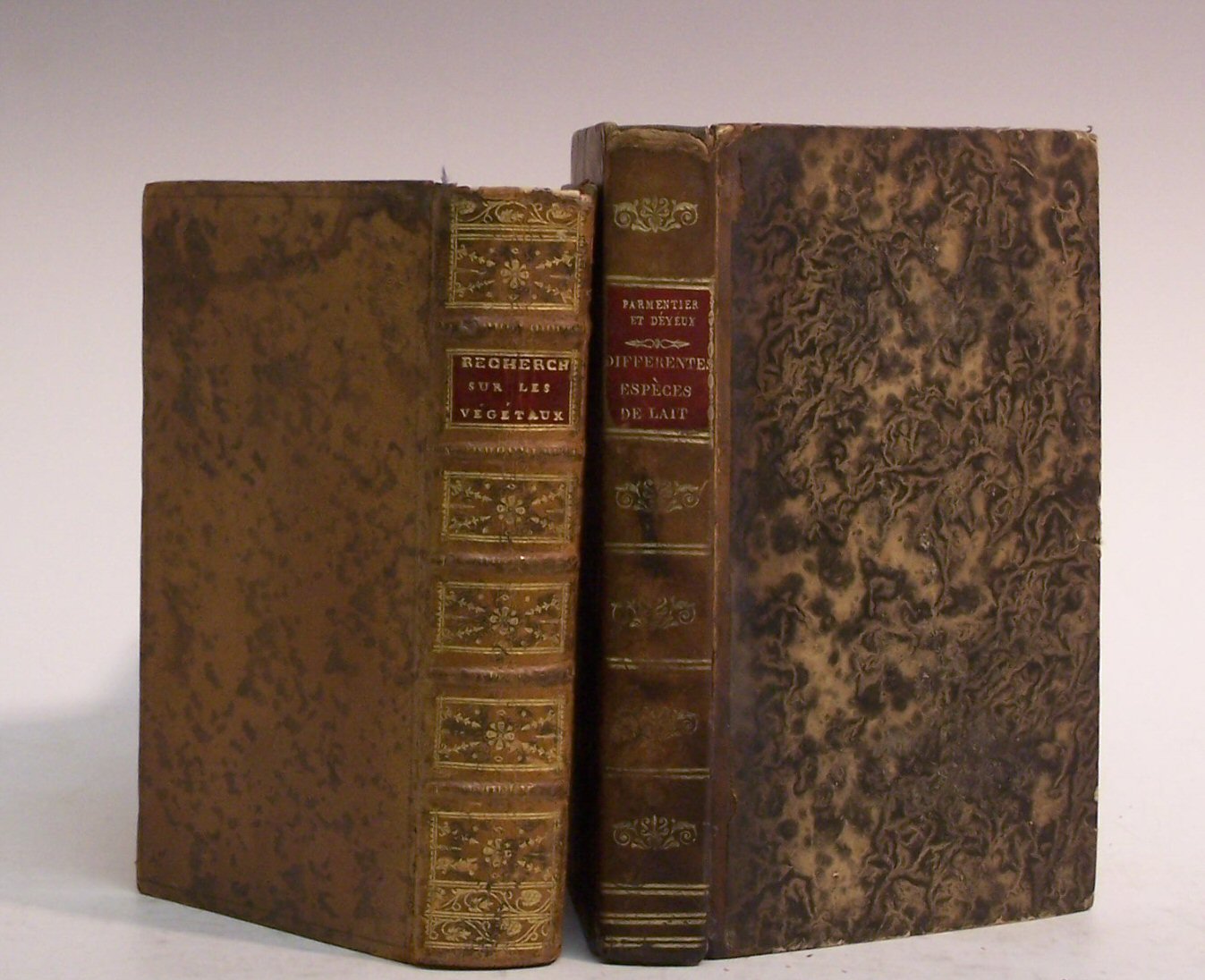 Recherches sur les végétaux nourrissans, qui, dans les temps de disette, peuvent remplacer les alimens ordinaires. Avec de nouvelles observations sur la culture des pommes de terre. Paris: Imprimerie royale, 1781, 8vo, one folding engraved plate, contemporary mottled calf, spine gilt in compartments, [Oberlé 693; Vicaire 657; Wellcome IV, p.308; Blake p.339], occasional light staining in margins, tear in plate repaired without loss, spine chipped at head; Ibid. and Nicolas Déyeux. Précis d'expériences et observations sur les différentes espèces de lait, considérées dans leurs rapports avec la chimie, la médecine et l'économie rurale. Strassburg: F.G. Levrault, et à Paris, chez Théoph. Barrois, an 7 [1799], 8vo, half-title, contemporary calf-backed boards, [Blake p.339], a few light damp-stains in margins, upper joint split (2)