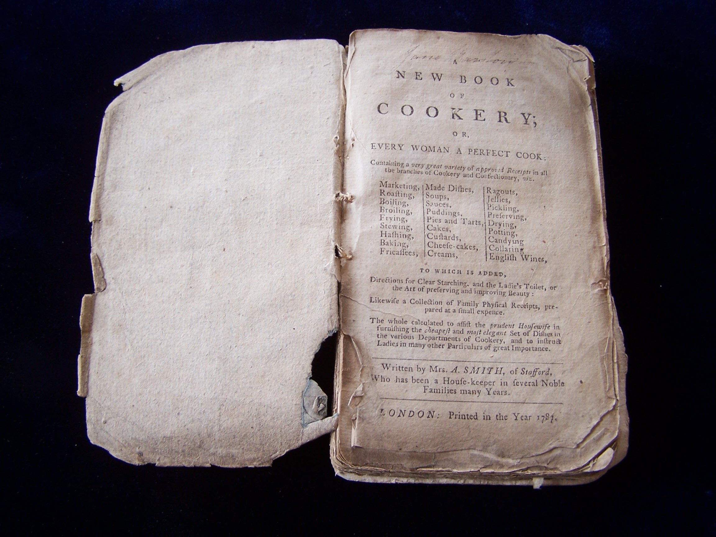 A new book of cookery; or every woman a perfect cook. London, 1787, 12mo, pp 208 [8], original wrappers, torn at hinges, discolouration along lower edges, corners folded, lacking backstrip, contemporary ink inscripition to title