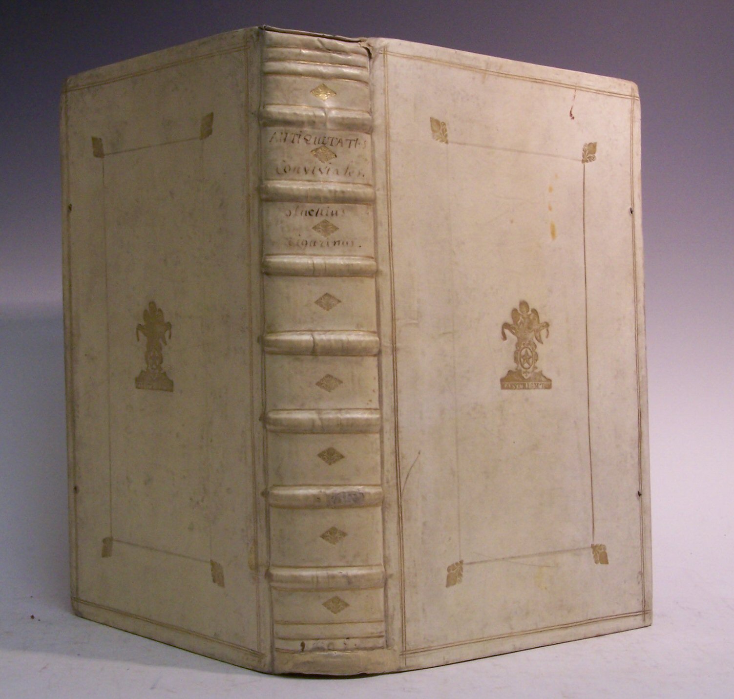 Operum tomus primus, continens antiquitatum convivialium libros tres (Operum tomus secundus, continens sacrorum et sacrificiorum gentilium). Leiden: Jacob Hack; Amsterdam: Henricus and the widow of Theodorus Boom, 1695, 2 volumes in one, folio (342 x 221mm.), engraved frontispiece, titles printed in red and black, woodcut device on title-pages, woodcut initials and tailpieces, contemporary vellum gilt with the arms of Maastricht on covers, a few marginal paper repairs