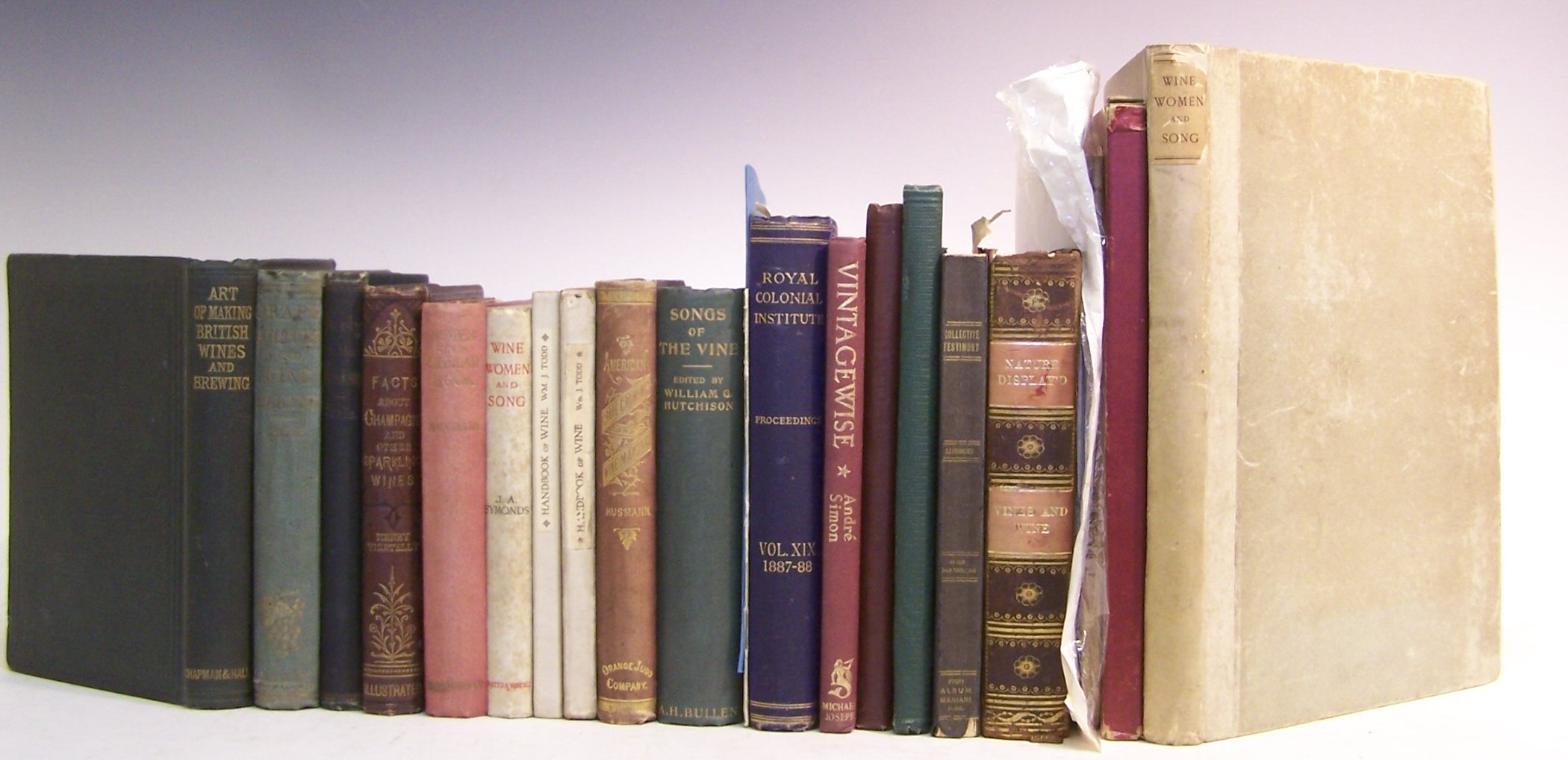 Open Air Grape Culture. New York: C.M. Saxton, 1862. First edition, presentation copy inscribed by the author, 8vo, illustrations, original cloth, slightly spotted, spine lightly marked; Thomson, William. A Practical Treatise on the Cultivation of the Grape Vine. Edinburgh: W. Blackwood, 1862. Second edition, 8vo, illustrations, original cloth, inscribed G. Hargreaves 1863 at head of title; Vizetelly, Henry. Facts about Champagne and other Sparkling Wines. London: Ward, Lock & Co., 1879. First edition, 8vo, plates, illustrations, original pictorial cloth; The Art and Mystery of British Wines, Cider and Perry, Cordials and Liqueurs. London: Chapman and Hall, 1865. First edition, 8vo, half-title, original cloth, inscription of C. Batchelor on endpaper and small stamp on title; Symonds, J.A. Wine, Women and Song. London: Chatto and Windus, 1884, First edition, one of 50 large paper copies, original parchment-backed boards, uncut, rather rubbed and soiled; Roos, L. Wine-Making in Hot Climates. Melbourne: Department of Agriculture, 1900, First English edition, 8vo, illustrations, original cloth; Husman, George. American Grape Growing and Wine Making. New York: Orange Judd, 1892, 8vo, original purple cloth gilt, spine faded, covers slightly discoloured; Ellis, John. A Reply to "The Academy's" Review of the "The Wine Question in the light of the new dispensation". New York: by the author, 1883, 8vo, original green cloth gilt, very slightly rubbed at head of spine with 20 others (28)