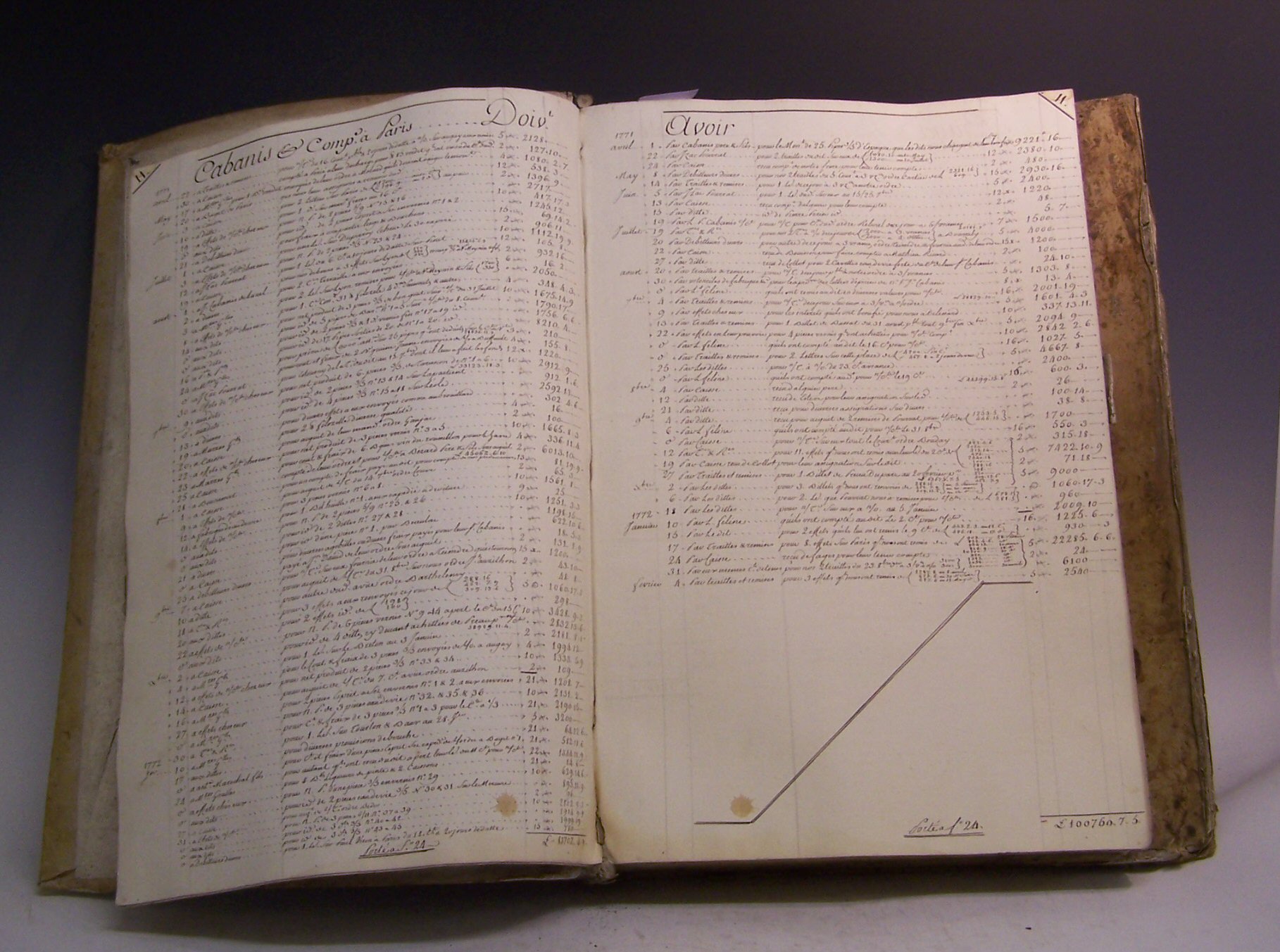 Account book of Cabanis frères, merchants of Montpellier in the late eighteenth century. Montpellier, 1771-1791, 370 pages, large folio (510 x 340mm.), on paper, with vellum markers, contemporary vellum boards with flap (worn and stained), some correspondence from their clients loosely inserted, some inserted papers dating from 1806