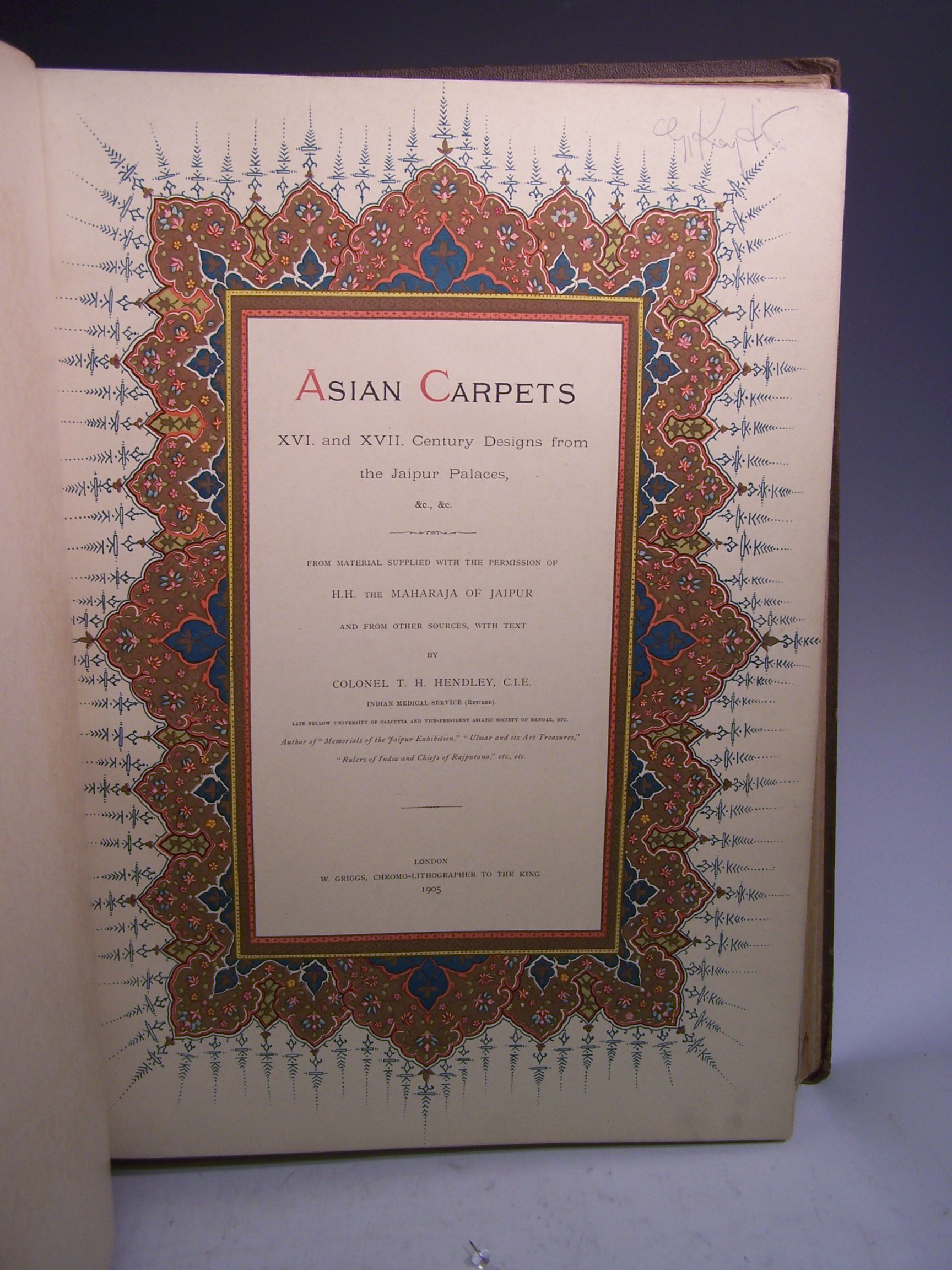 Asian carpets. XVI and XVII designs from the Jaipur Palaces. London: W Griggs, 1905, folio, chromolithograph title, map, 157 plates [including 7 supplementary plates], later quarter morocco gilt, rubbed, some staining to lower edge, plates not affected, owners ink inscription to title