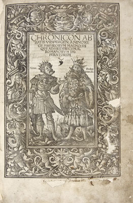 Chronicon abbatis Urspergen. a Nino rege Assyriorum Magno. Augsburg: Joannes Miller, 1515, first edition, small folio, woodcut title, hand-coloured initials, double column, contemporary blind-stamped calf , ruled with crowned and other heads and floral roll-tooled panels, lacking A2-C6, title with several holes (repaired), rebacked retaining spine, corners repaired